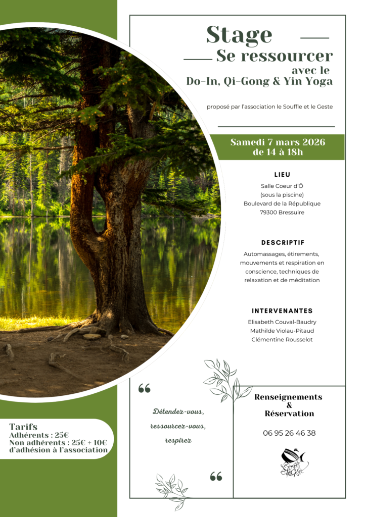 Au programme : Automassages, étirements, mouvements et respiration en conscience, techniques de relaxation et de méditation.